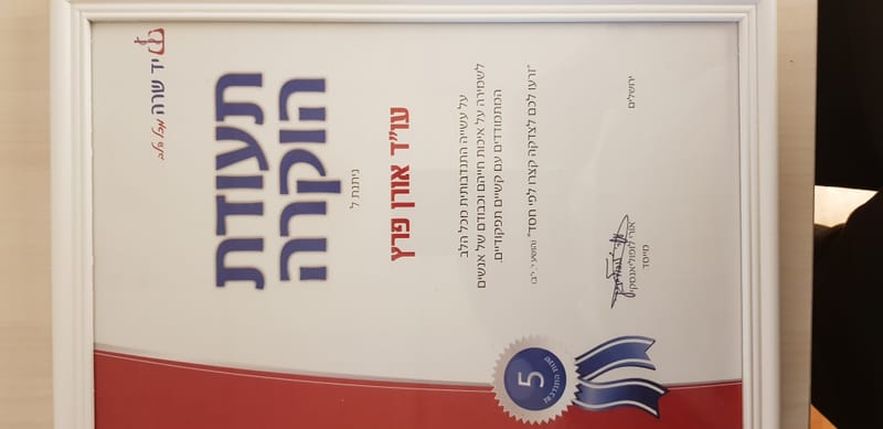 יד שרהתעודת הוקרה לעו"ד אורן פרץ